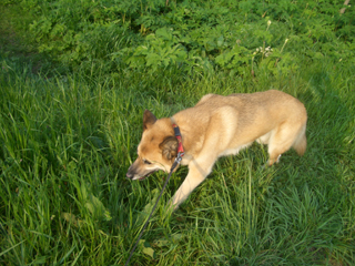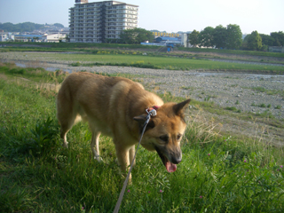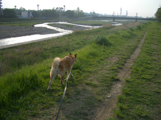 最近、忙しかったり天気悪かったりで長時間の散歩してなかったので今日は久々に河原コース。なんだか随分緑になってたデス。