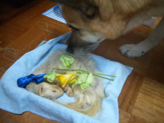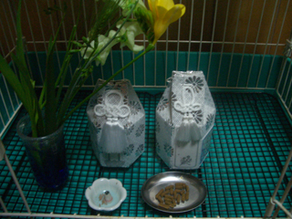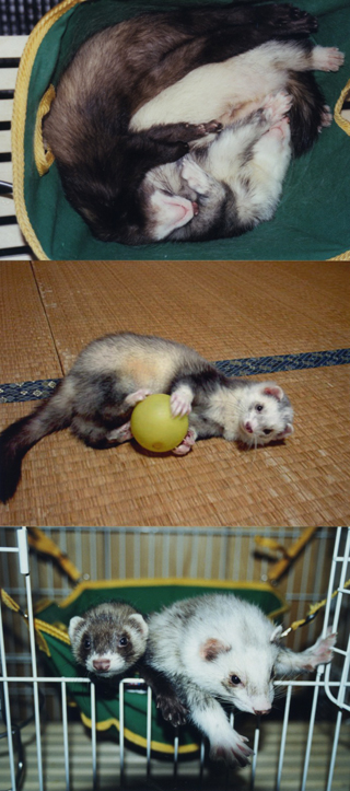 ケンサンは確かにオジイチャンだけどフェレの平均寿命がよく分からなかったんでオジイチャンと云ってもどの位のオジイチャンなのか分からなくって、『他のフェレはもっと長生きしてるのかな?』とか『早死にさせてしまうかも』と云う不安があったんですが、病院に来る3大エキゾチックアニマルのウサギ、モルモット、フェレット達の寿命は大体6歳位なんだそうです。その中では後2ヶ月で8歳のケンサンはかなりの高齢レベルに入るそうデス。コレ聞いて変な話かもですがホントに満足しました。