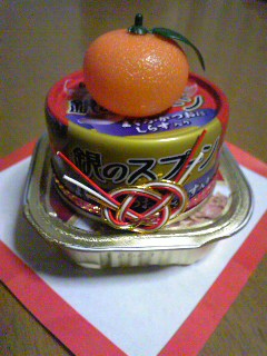下の缶詰鏡餅。上のミカンとか紙とか飾りの紐とかセットで大阪からやって来マシタ。ヒマな兄です。
